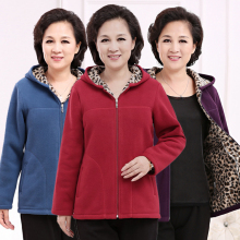 秋装新款中老年女装连帽豹纹摇粒绒卫衣妈妈装大码抓绒加厚外套
