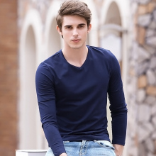 秋季男士长袖t恤男 纯色v领修身简约体恤男黑色大码打底衫男薄款