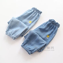 澄子家女童装 2017夏款 儿童仿牛仔夏凉裤 天丝棉绣皇冠九分裤