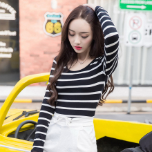 端木紫秋装简约修身百搭细条纹长袖T恤女圆领上衣休闲打底衫体恤
