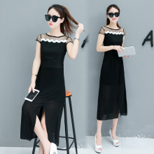 雪纺连衣裙女夏季2017新款短袖韩版修身开叉网纱黑色过膝长裙夏装
