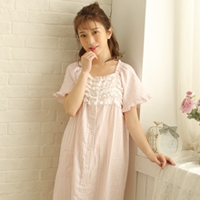 夏季睡衣女日系奢华蕾丝条纹可爱睡裙纯棉纱布薄款方领短袖家居裙