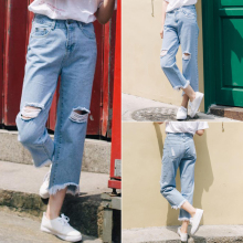2017夏季新款宽松显瘦破洞浅色牛仔阔腿裤韩国休闲九分裤子女学生