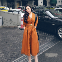C家春装新款女装欧美高腰V领显瘦中袖风衣款大摆连衣裙长裙