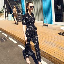 C家夏装新款女装欧美复古印花V领高腰显瘦短袖雪纺连体裤女
