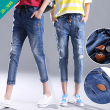大码松紧腰七分裤女夏破洞休闲牛仔裤弹力宽松胖mm哈伦裤八分裤薄