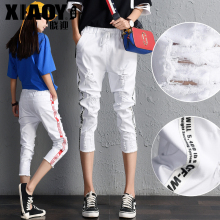 破洞牛仔裤女2017新款宽松哈伦裤松紧腰七分牛仔裤女夏毛边缩脚裤