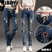 破洞牛仔裤女长裤子2016春秋松紧腰大码胖MM宽松哈伦裤刺绣小脚裤