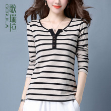 歌瑞拉2017 春装新品T恤女 长袖上衣春秋弹力修身条纹女装打底棉