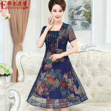 新款中老年蕾丝绣花中长款妈妈装连衣裙女 40-50大码修身印花裙夏