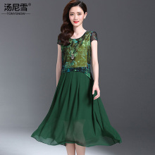 妈妈装雪纺连衣裙汤尼雪夏季印花中裙中年夏天碎花长款名媛淑女裙