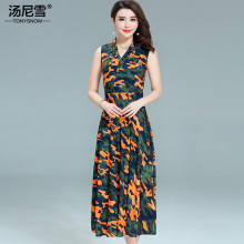 中年女连衣裙夏40-50岁妈妈汤尼雪长款大摆修身V领无袖裙子女