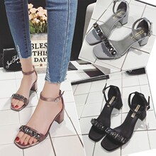 凉鞋女夏2017新款一字带高跟皮黑色粗跟方头露趾包跟夏天鞋子女