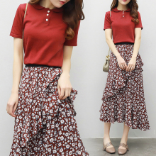 2017夏季新款女装韩版气质荷叶边碎花雪纺连衣裙中长款印花套装裙