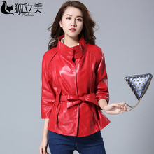 狐立美2017春秋新款海宁真皮皮衣女士短款束腰显瘦绵羊皮外套风衣