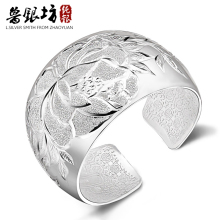 【鲁银坊】S999足银莲花心经纯银手镯宽版时尚银手镯女送妈妈银饰