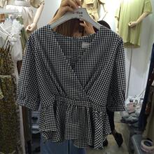 夏装不规则荷叶边娃娃衫高腰显瘦后背纽扣V领格子衬衫短袖上衣女