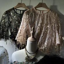 THEONE2017春装新款韩版重工亮片闪片透视女装流苏宽松网纱上衣潮