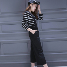 2016秋季新款韩版宽松学院时尚黑白条纹套装九分背带裤两件套套装
