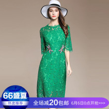 口米大麦女装春装2017新款潮时尚蜻蜓钉珠中袖修身气质蕾丝连衣裙