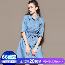 口米大麦女装夏装2017新款潮钉珠刺绣拼接网纱气质宽松牛仔连衣裙