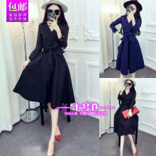 2016秋季新款V领长袖小香气质系带收腰显瘦中长款大摆连衣裙女