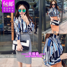 2016夏季新款韩版时尚一字领条纹T+修身显瘦绑绳牛仔背带裙女119G