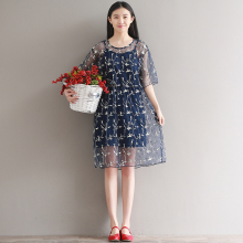 棉麻家2017新款春夏季文艺系森女刺绣花朵网纱连衣裙吊带两件套