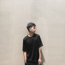 暗黑系2017新款男士夏季青年日系半袖日系七分袖割破圆领T恤潮流