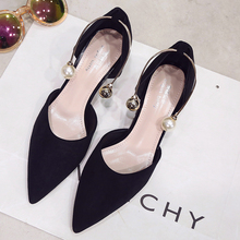 2017春夏季新款尖头单鞋女中跟珍珠女鞋中空鞋高跟凉鞋女夏粗跟鞋