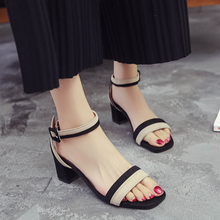 2017夏季新款韩版高跟凉鞋女粗跟露趾拼色罗马鞋一字扣带中空女鞋