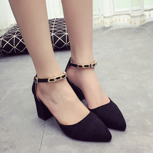 2017春夏季新款尖头浅口单鞋女韩版粗跟高跟鞋一字扣凉鞋女夏女鞋