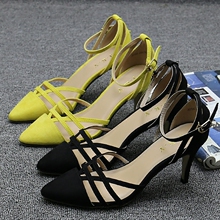 2016尖头高跟鞋脚腕绊带细跟单鞋女 一字扣包头绒面通勤凉鞋女鞋