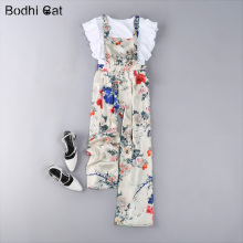 意大利制2017夏装新款圆领荷叶边T恤+花色背带休闲裤两件套装女