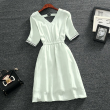夏装新款韩版小清新中长款短袖连衣裙学生淑女裙松紧收腰v领裙子