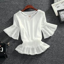 蕾丝打底衫镂空2017新款女装夏装百搭喇叭袖套头小衫收腰显瘦上衣