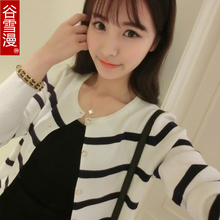 2017春装新款女装短款长袖修身印花无扣开衫纯色针织衫毛衣外套潮