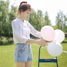 2017夏季新款韩版宽松竖条纹衬衣女七分袖V领雪纺衬衫打底上衣