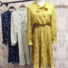 雪纺连衣裙女春夏秋中长款长袖蝴蝶结韩版松紧高腰碎花百褶打底裙