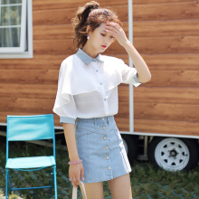 2017夏季新款韩版拼色百搭大荷叶领雪纺衬衫女装宽松上衣学生衬衣