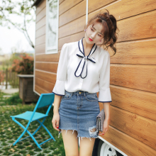 韩范白色衬衣女夏装系带蝴蝶结雪纺衬衫女七分袖韩版宽松百搭上衣