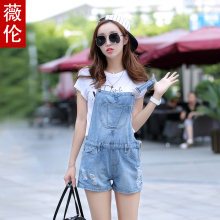 2016夏季韩版浅蓝色破洞连体牛仔背带短裤女显瘦热裤休闲吊带裤潮