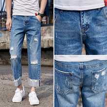 个性复古破洞水洗牛仔裤潮男青年小直筒翻边裤脚九分裤男生乞丐裤
