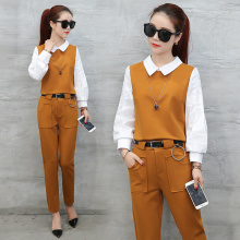 雪纺衬衫两件套女2017春装新款小香风女装韩范小脚裤职业时尚套装