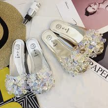 2017夏季新款韩版亮片水钻花朵平跟包头拖鞋一字型凉拖鞋女鞋子潮