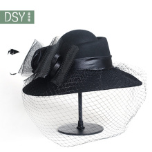 欧美英伦赫本礼帽大檐羊毛毡毛呢帽子秋冬宴会女士保暖网纱大花