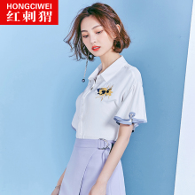 刺绣白衬衫女夏装2017新款清新撞色荷叶边衬衣女短袖宽松雪纺上衣