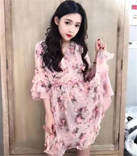欧洲站2017夏装新款时尚百搭洋气立体花朵花色v领喇叭袖连衣裙女