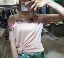 欧洲站2017夏装新款时尚百搭重工钉珠亮片立体花朵露肩镂空T恤女