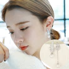925纯银耳钉女 韩版时尚个性不对称天使翅膀耳坠天然珍珠水钻耳环